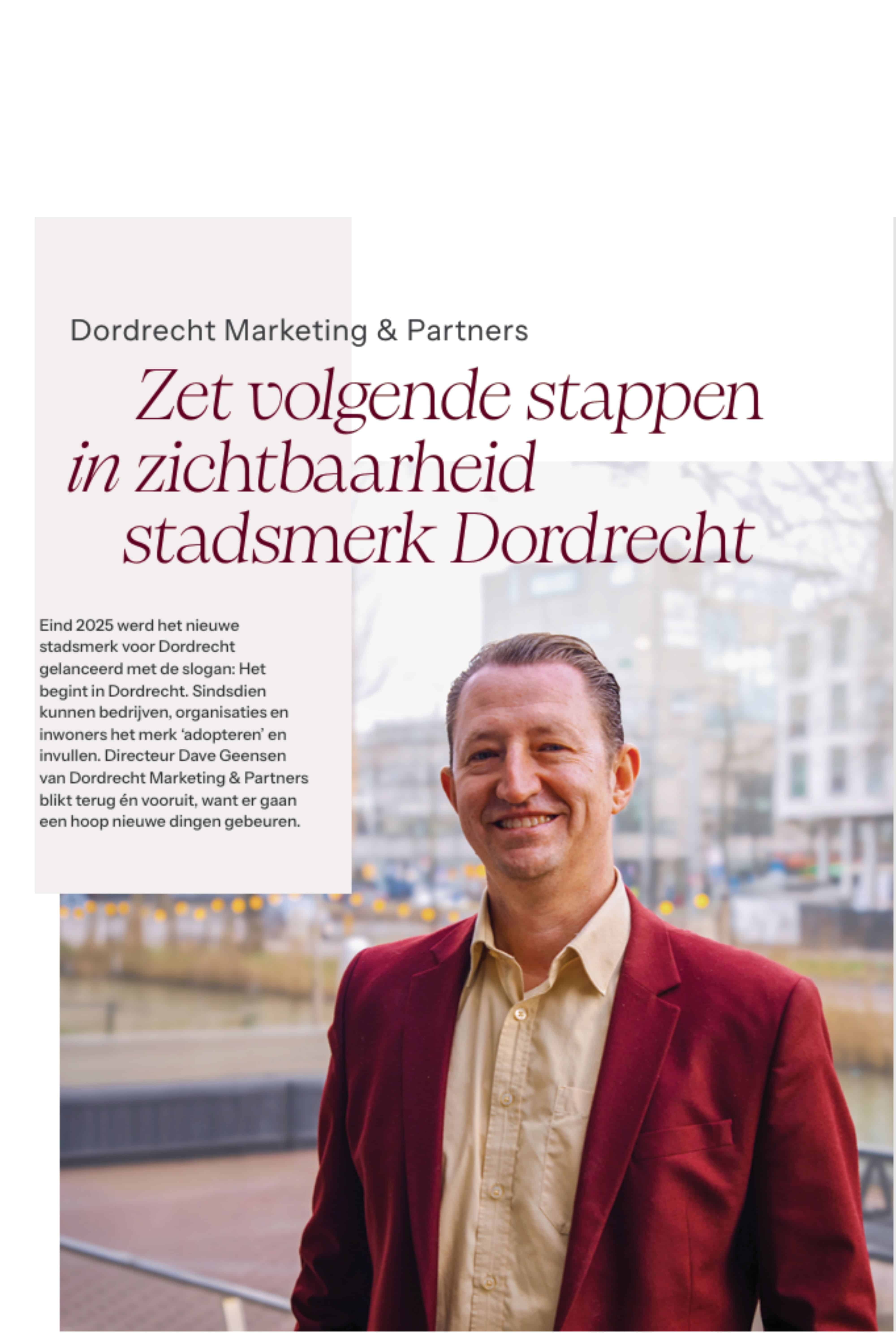 Directeur Dave Geensen van Dordrecht Marketing & Partners blikt in het magazine terug en vooruit, want er gaan een hoop nieuwe gebeuren. “We hebben met de input van zo’n 80 organisaties de basis en kaders gelegd om de verhalen van Dordrecht te vertellen. Het gaat uiteindelijk om de inhoud; het merk is vooral een kapstok. Laten we met elkaar optrekken en de fraaie verhalen met de wereld gaan delen, die volgende stap is nu. We zijn begonnen!”